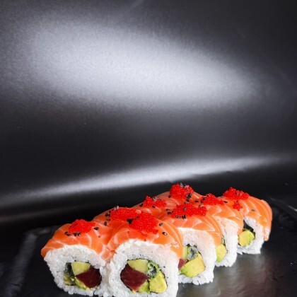 Rice, nori, salmon, shrimp tempura, onion, cheese cheddar, tobiko, unagi sauce, cheese Parmesan.