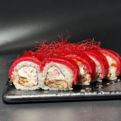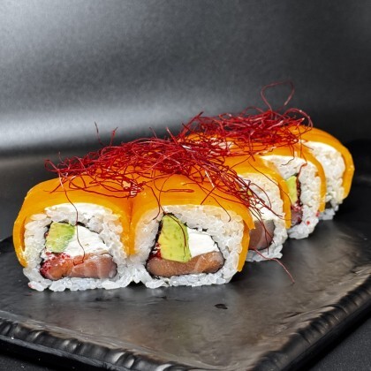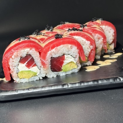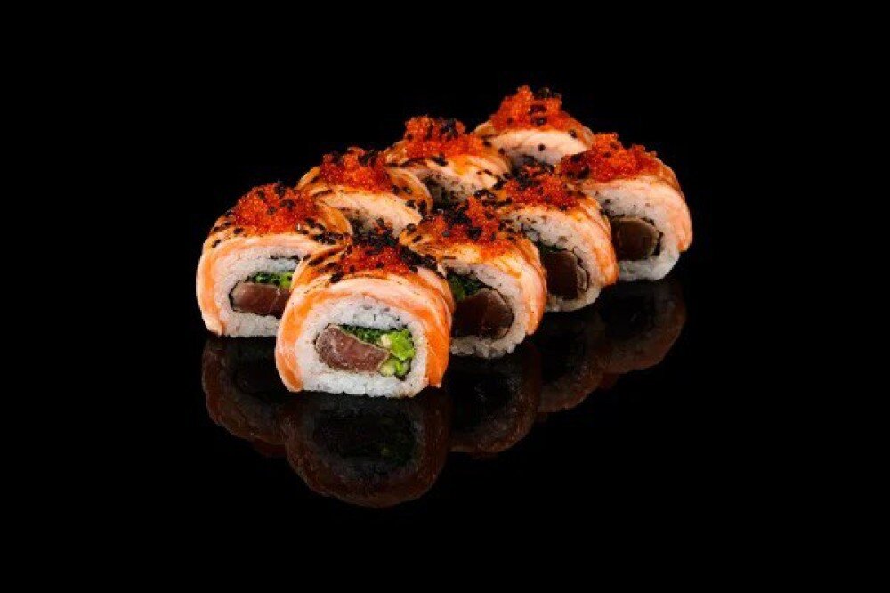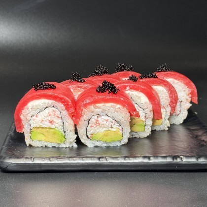 Rice, nori, salmon, tuna, cucumber, avocado, onion, tobiko, sesame.