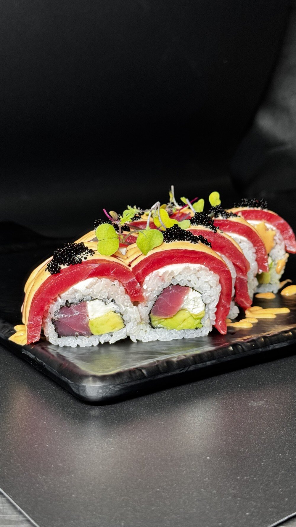 Rice, nori, tuna, avocado, cream cheese, tobiko, spicy sauce.