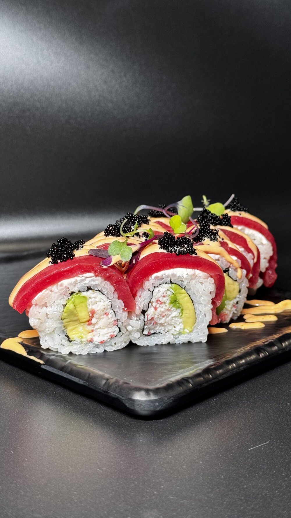 Rice, nori, tuna, imitation crab (mayo), avocado, tobiko, spicy sauce.