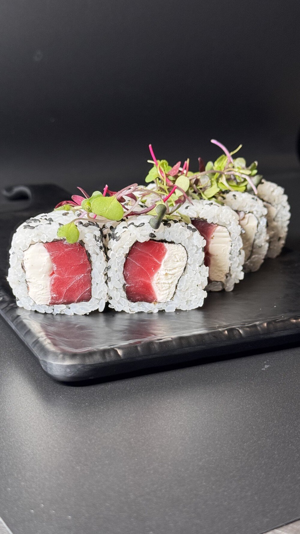 Rice, nori, tuna, cream cheese, sesame.