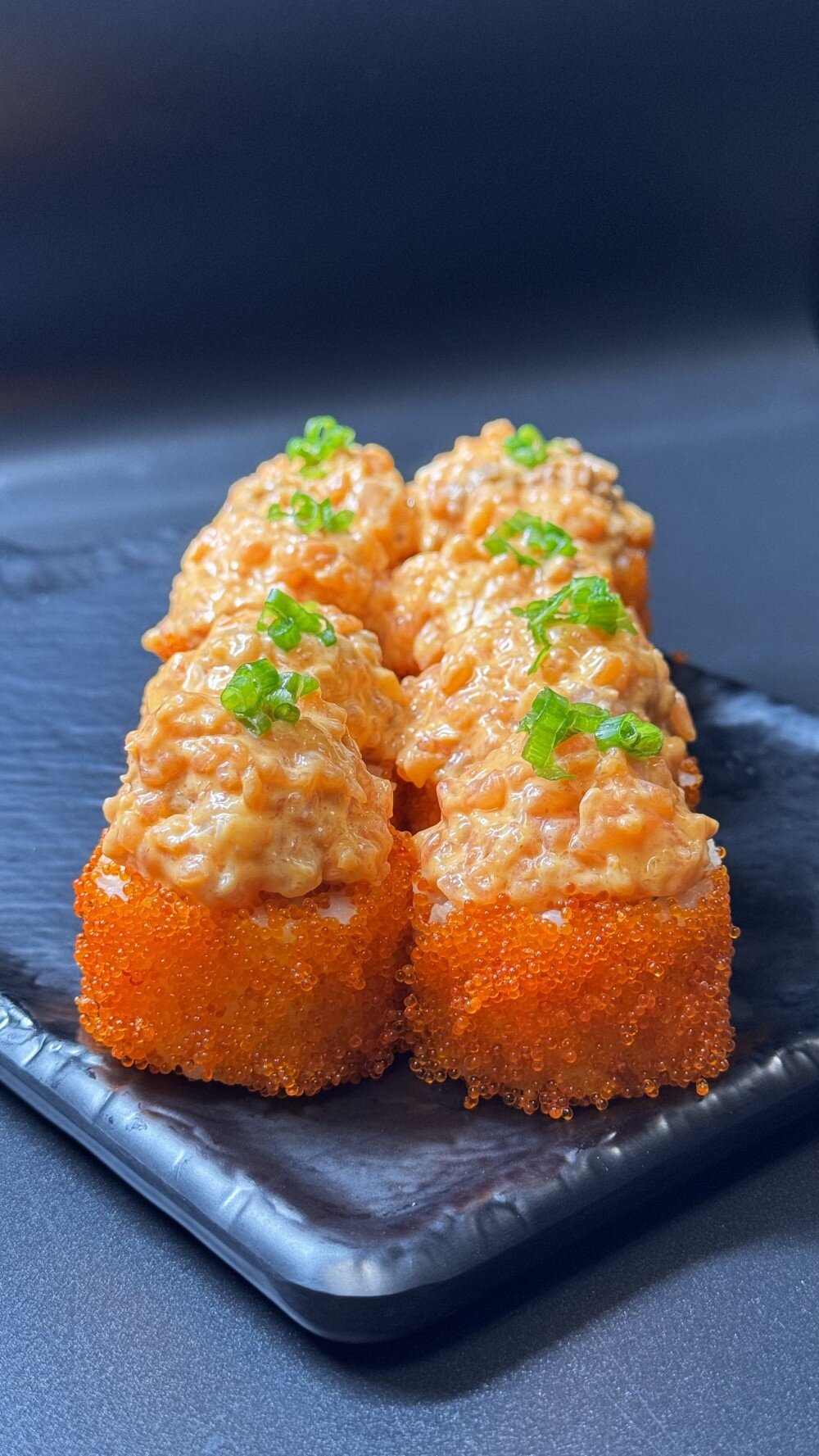 Rice, nori, salmon, cucumber, cream cheese, tobiko, spicy sauce, green onion.