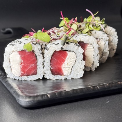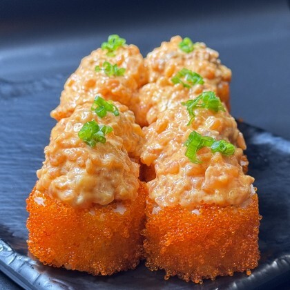 Smoked Eel (Top), Salmon (Raw), Cucumber, Unagi Sause, Sesame.