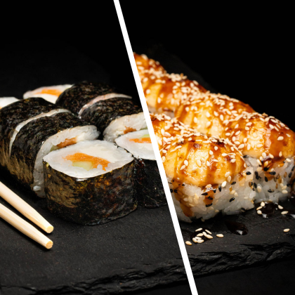 Ebi Maki - Shrimp. Classic Shrimp - Shrimp, Imitation Crab (mayo), Cucumber, Cheese Sauce, Unagi Sauce, Sesame.