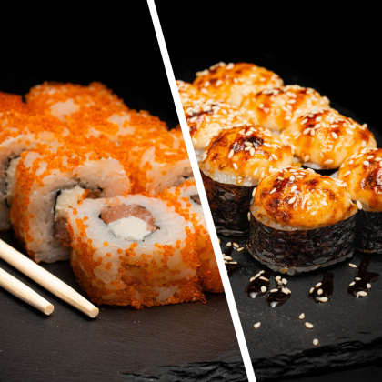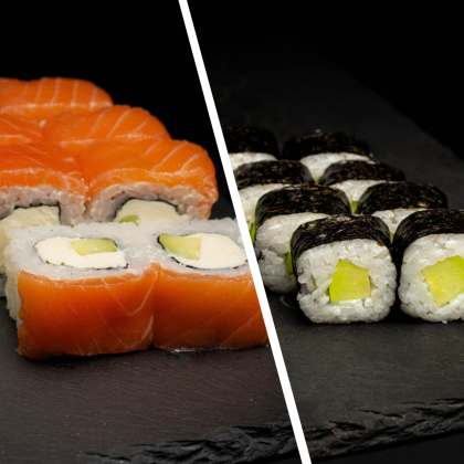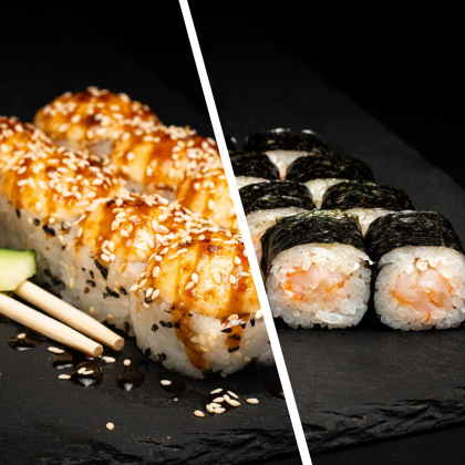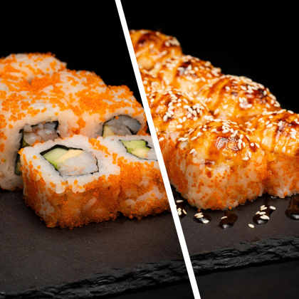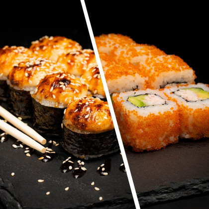 Sake Cheese - Salmon (raw), Cream Cheese, Cucumber. Sensei - Smoked Salmon, Cream Cheese, Avocado, Cheese Sauce, Unagi Sauce, Sesame.
